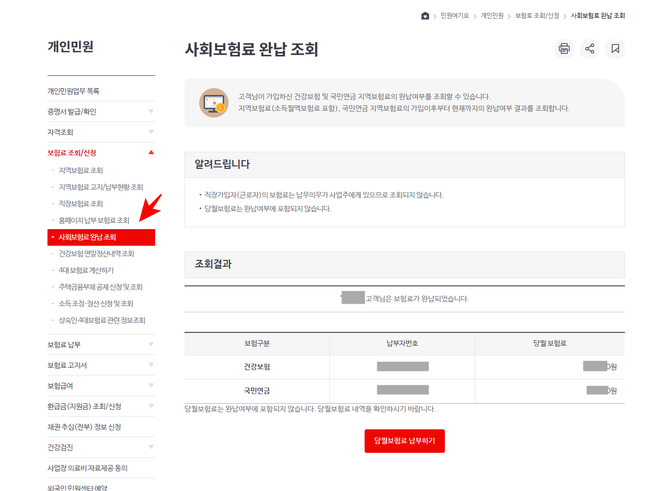 📌 지역보험료 고지/ 납부현황조회를 클릭하셔도 미납금액을 확인하실 수 있습니다.