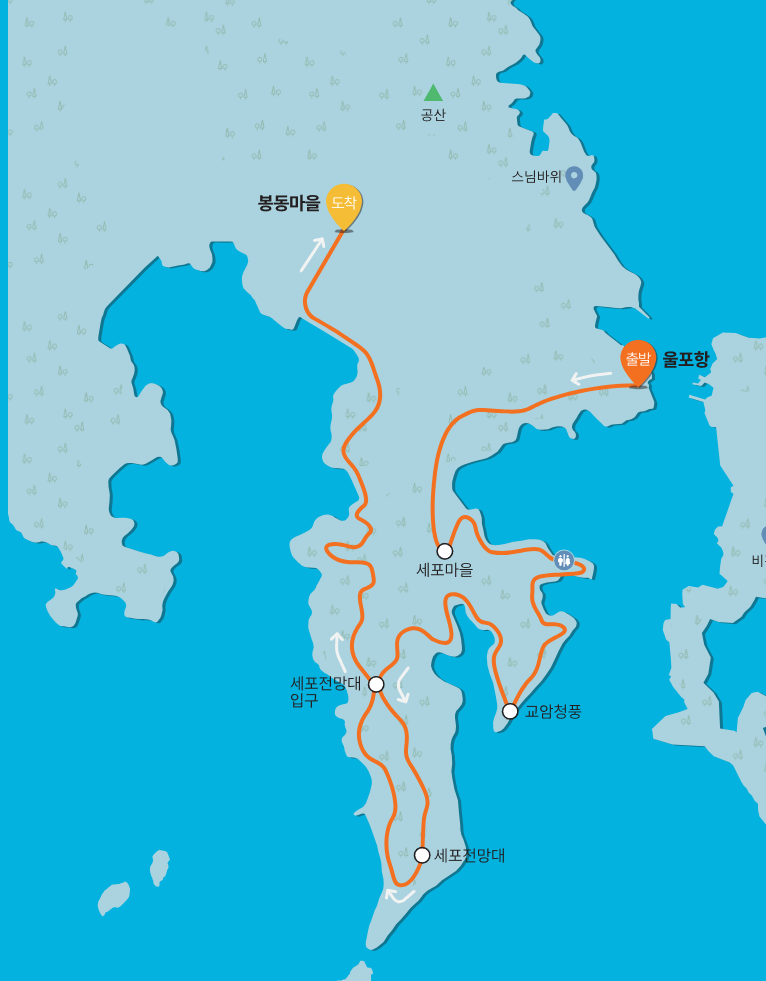 울포항 → 세포마을 → 교암청풍 → 세포전망대 입구 → 세포전망대 → 세포전망대 입구 → 봉동마을